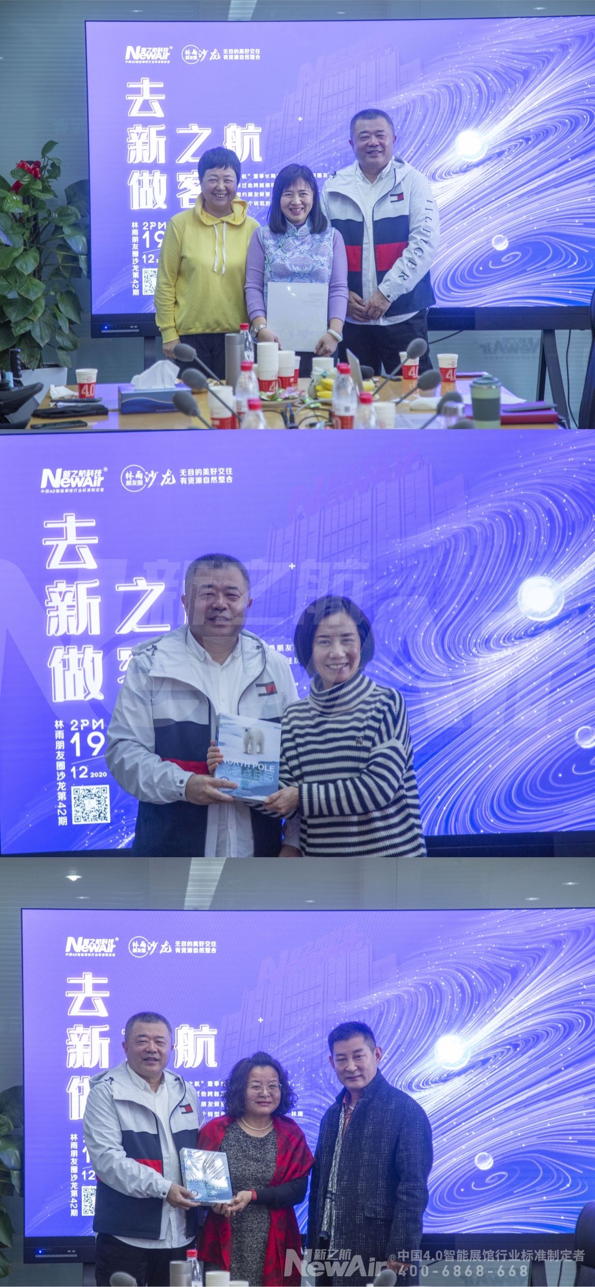 董事长鞠航将自己创造基尼斯世界纪录的《南极点日记》、《北极点日记》著作赠送给大家“林雨朋友圈”是新之航的老朋友,过去的岁月“林雨朋友圈”几次邀请新之航董事长鞠航分享南极点、北极点探险经历,这次“林雨朋友圈”莅临新之航体验新之航作为中国4.0智能展馆行业标准制定者的创新设计之美,“林雨朋友们”通过鞠航董事长的分享见识了新之航人20年来赴90多个国家考察的全球2000多个知名博物馆、展览馆、科技馆的设计之美,见识了拥有20年创意设计经验、600名创意设计师、800多个经典展馆案例的新之航作为中国头部智能展馆设计公司的风采,更见识了新之航近几年设计的2018上合组织青岛峰会、闯关东展览馆、数字山东馆、华为智慧城市馆、济南智慧城市馆等100多个全国知名展馆,见识了新之航设计的被《人民日报》点赞的北京鲁能集团党建馆、3000平米鲁南制药集团党建馆等大型党建馆,见识了新之航设计的获得基尼斯世界纪录和亚洲、全国展馆设计大奖的数十个现代展馆……“林雨朋友圈”粉丝多为文化传媒人士,大家在科技创意公司新之航找到了“家”的感觉,大家纷纷从科技创新生活到创意美化世界发表感想,共同畅想美好的2021年!