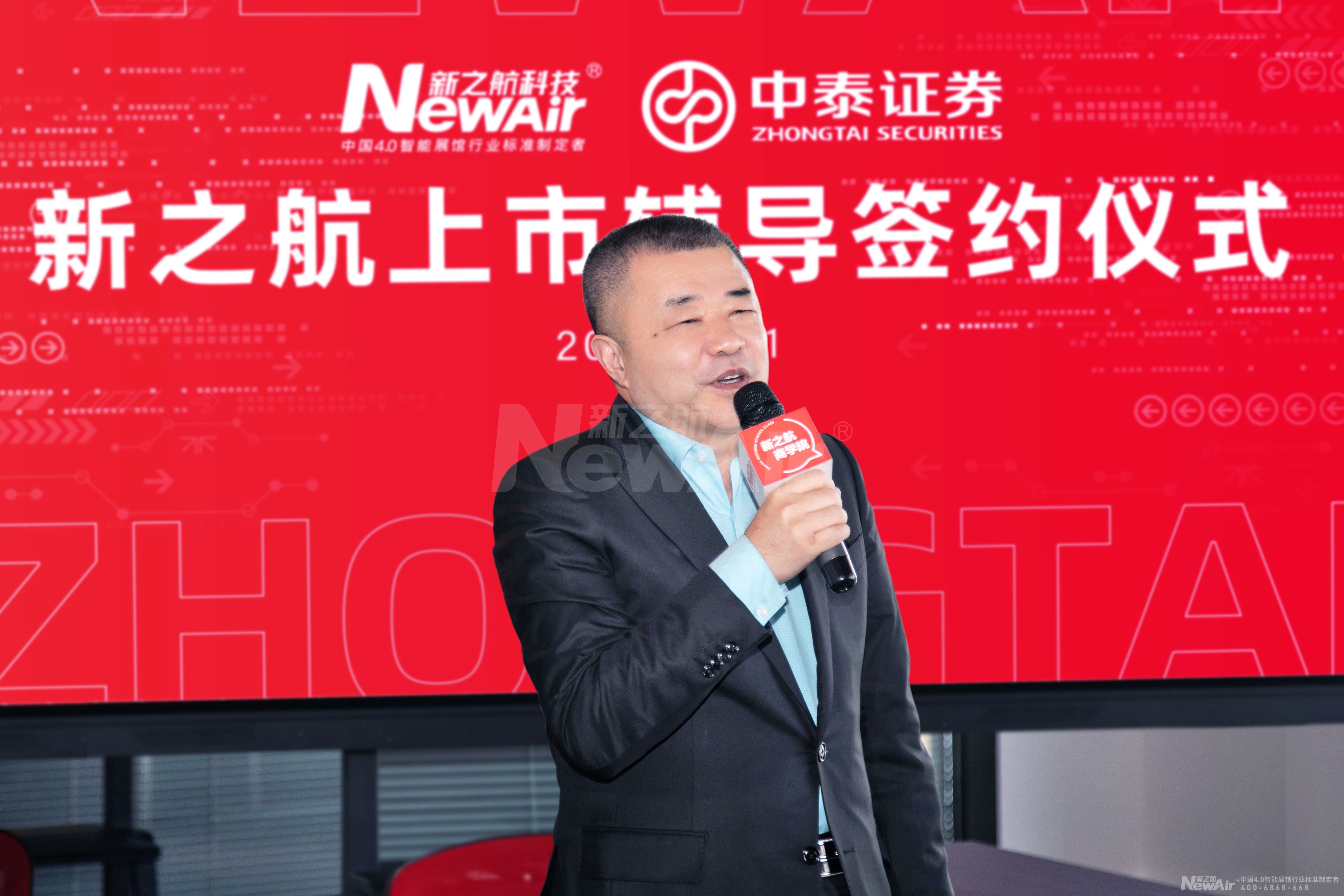 签约仪式由新之航传媒科技集团有限公司策划设计中心总经理杨凯主持,中国电子商会数字展示专业委员会秘书长赵峰;中泰证券股份有限公司副总经理、董事会秘书张晖;新之航传媒科技集团有限公司董事长鞠航分别致词。中泰证券股份有限公司投行委副主任、董事总经理朱锋、新之航传媒科技集团有限公司总经理傅绎锦代表双方公司签署新之航上市辅导合约。