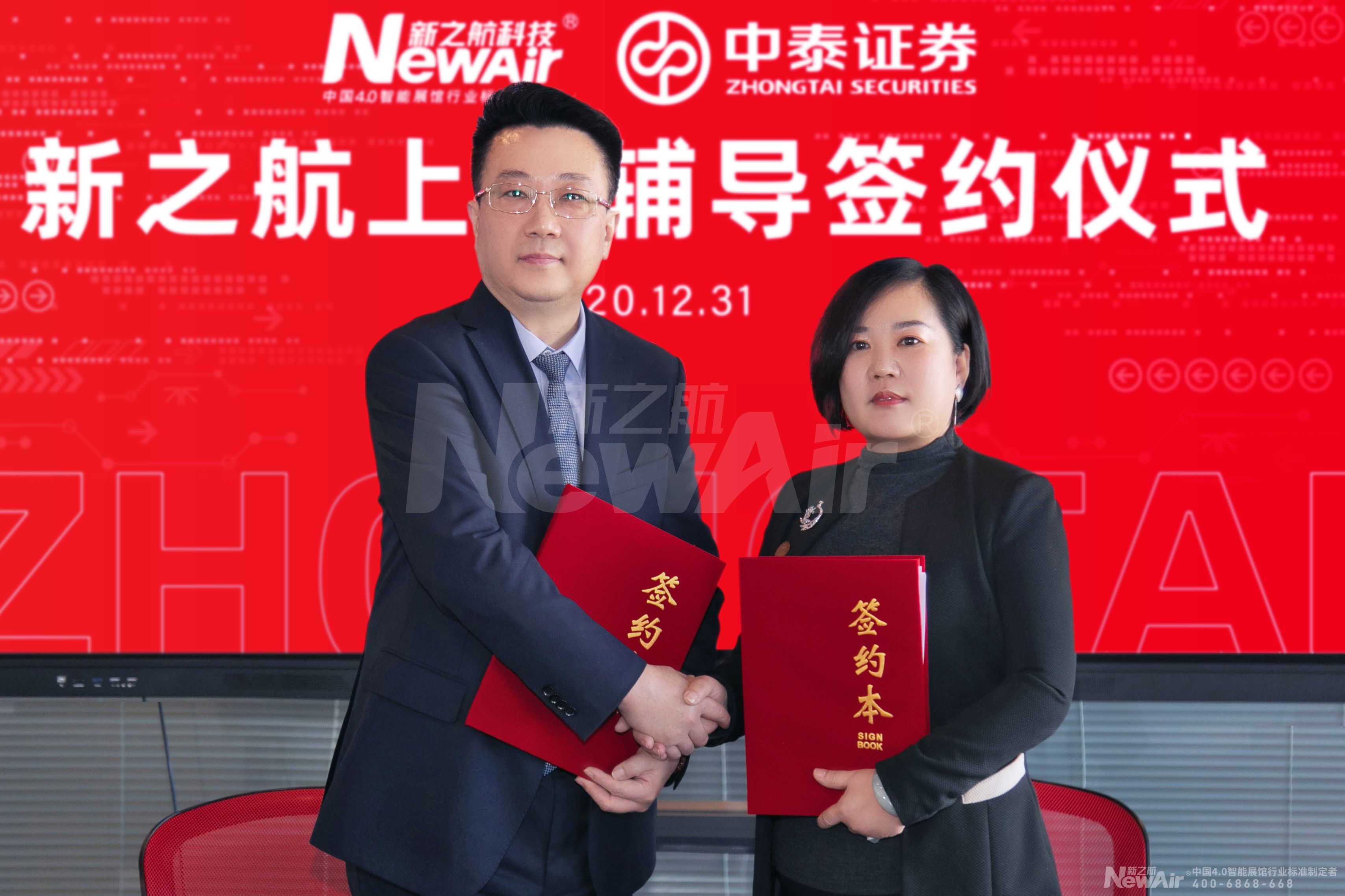 2020年12月31日上午,新之航传媒科技集团有限公司上市辅导签约仪式在新之航商学院举行,中国电子商会数字展示专业委员会秘书长赵峰;中泰证券股份有限公司副总经理、董事会秘书张晖;中泰证券股份有限公司投行委副主任、董事总经理朱锋;新之航传媒科技集团有限公司董事长鞠航、新之航传媒科技集团有限公司总经理傅绎锦等领导及新之航部分员工代表参加签约仪式。