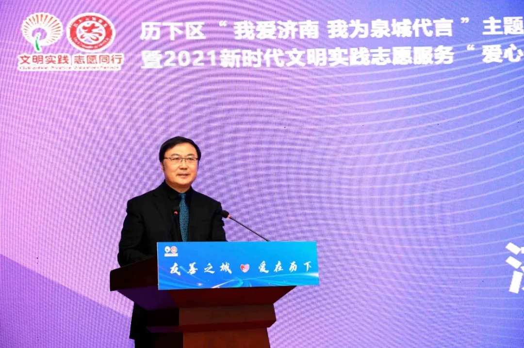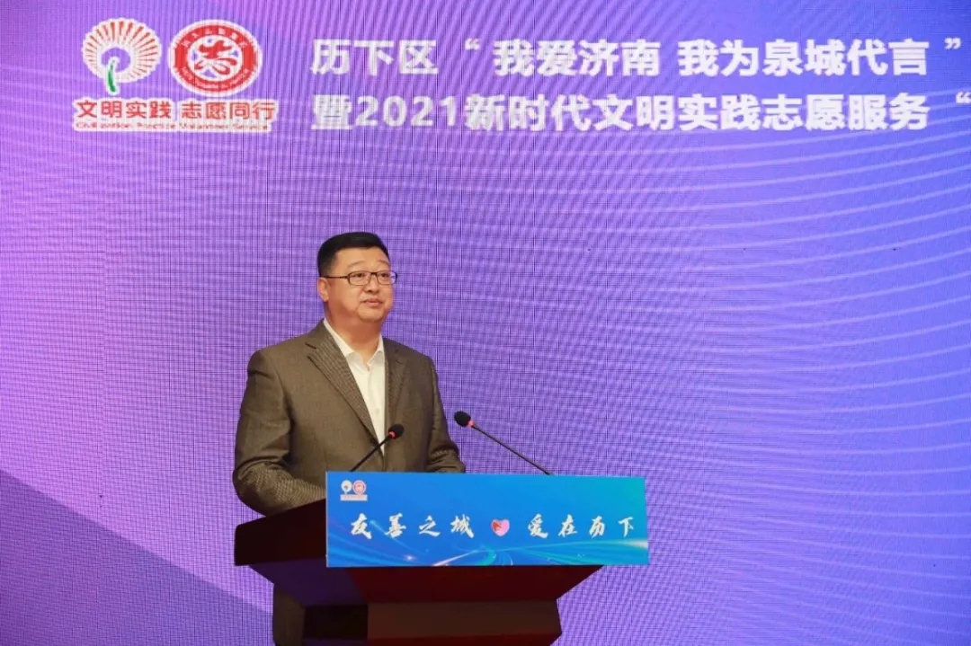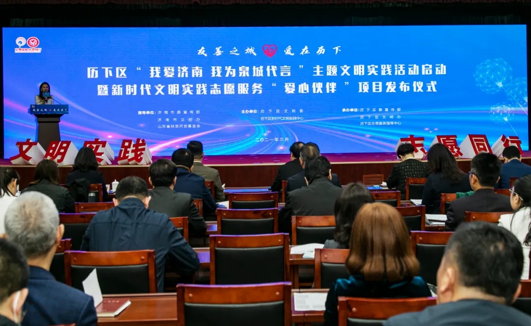历下区委常委、宣传部部长王海清介绍了“我爱济南 我为泉城代言”主题文明实践活动和志愿服务“爱心伙伴”项目计划相关情况