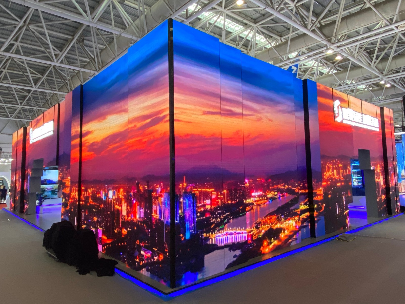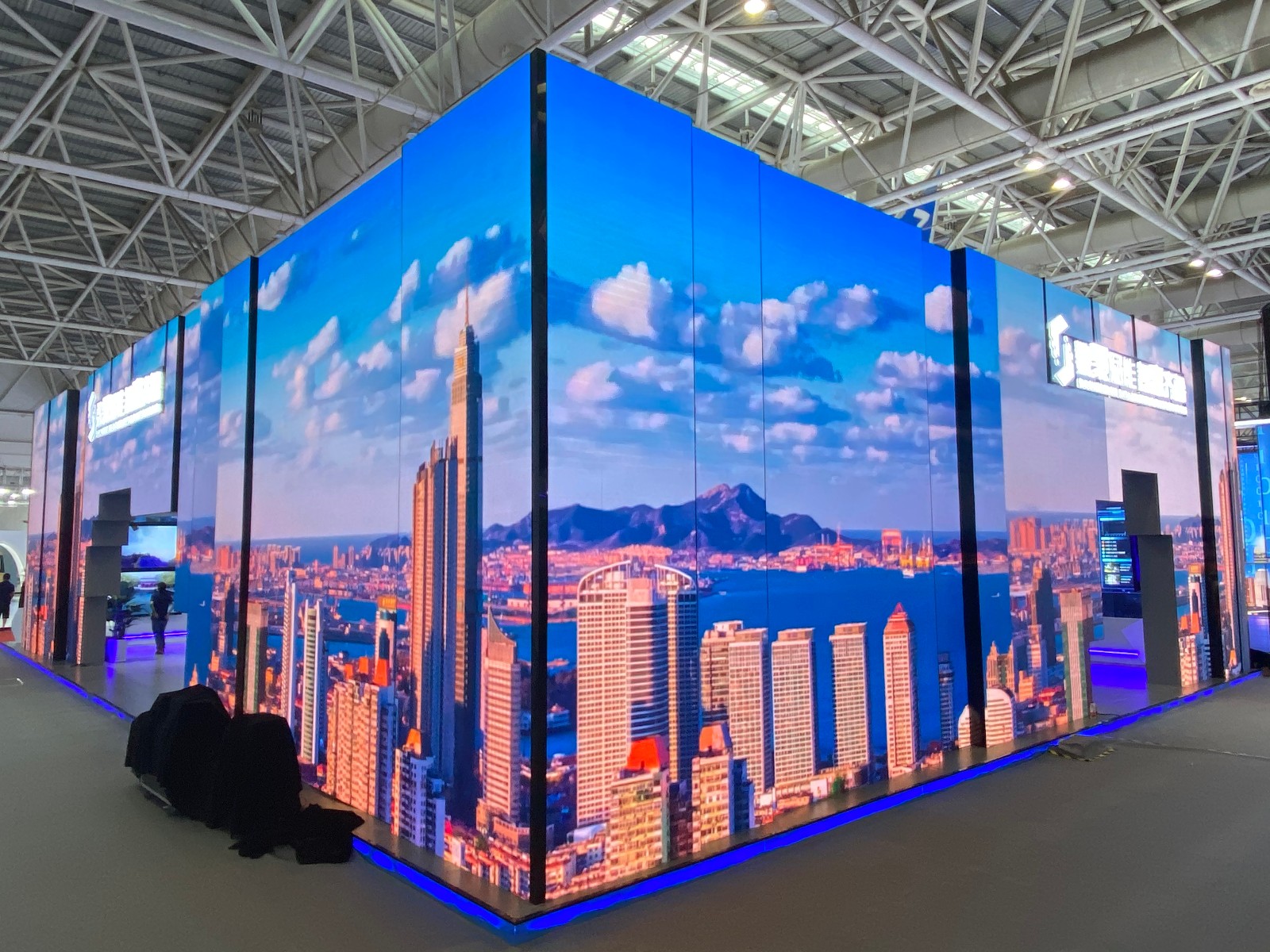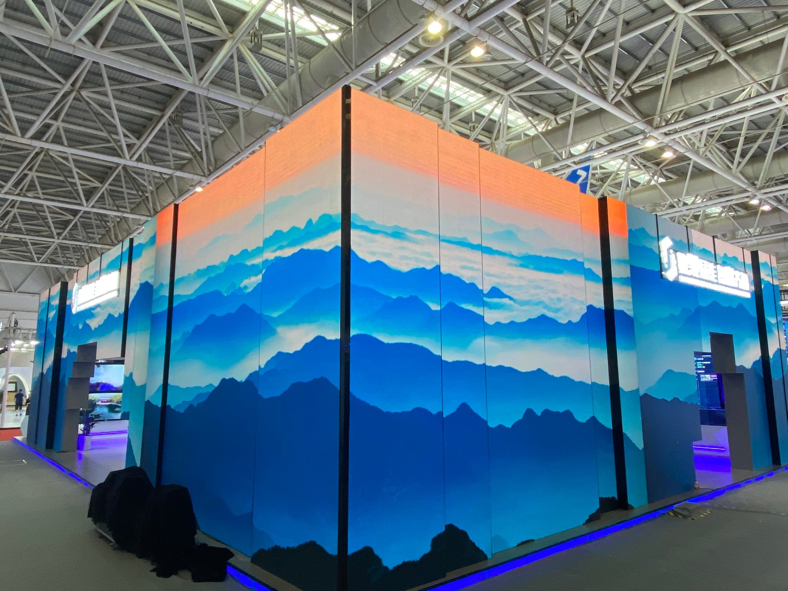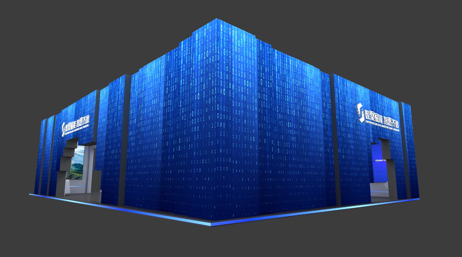 数字山东馆色彩采用智慧蓝、简约白、科技灰,将数字特色及山东基因植入。在展馆策划和设计过程中,新之航摒弃了纷繁复杂的传统框条设计模式,独创“4.0智能盒子”理念,以立方体为展馆外观原型,运用LED屏幕错落排列营造韵律感;馆内三大区域设有LED双面屏、立方体桌椅、顶部吊装LED正方体等数字智慧立方体与展馆整体造型相呼应,蕴含数字、智慧、未来之意,以极简的几何美学和数字化廓形打造出数字山东馆“4.0智能盒子”。