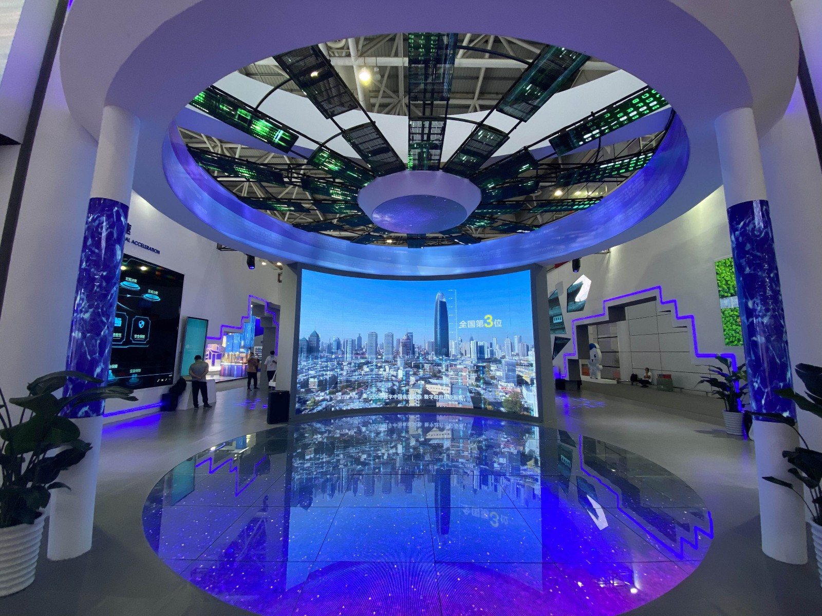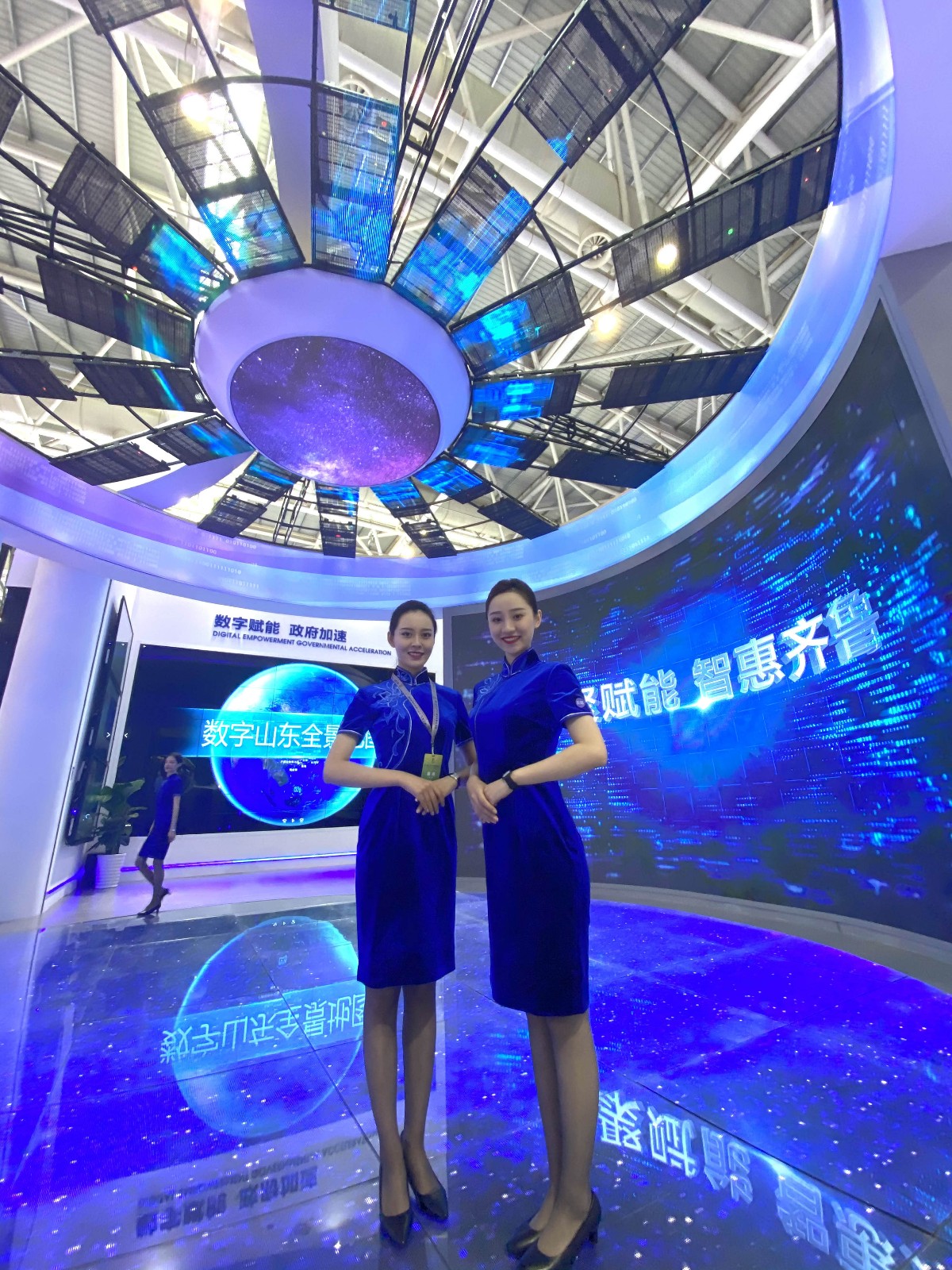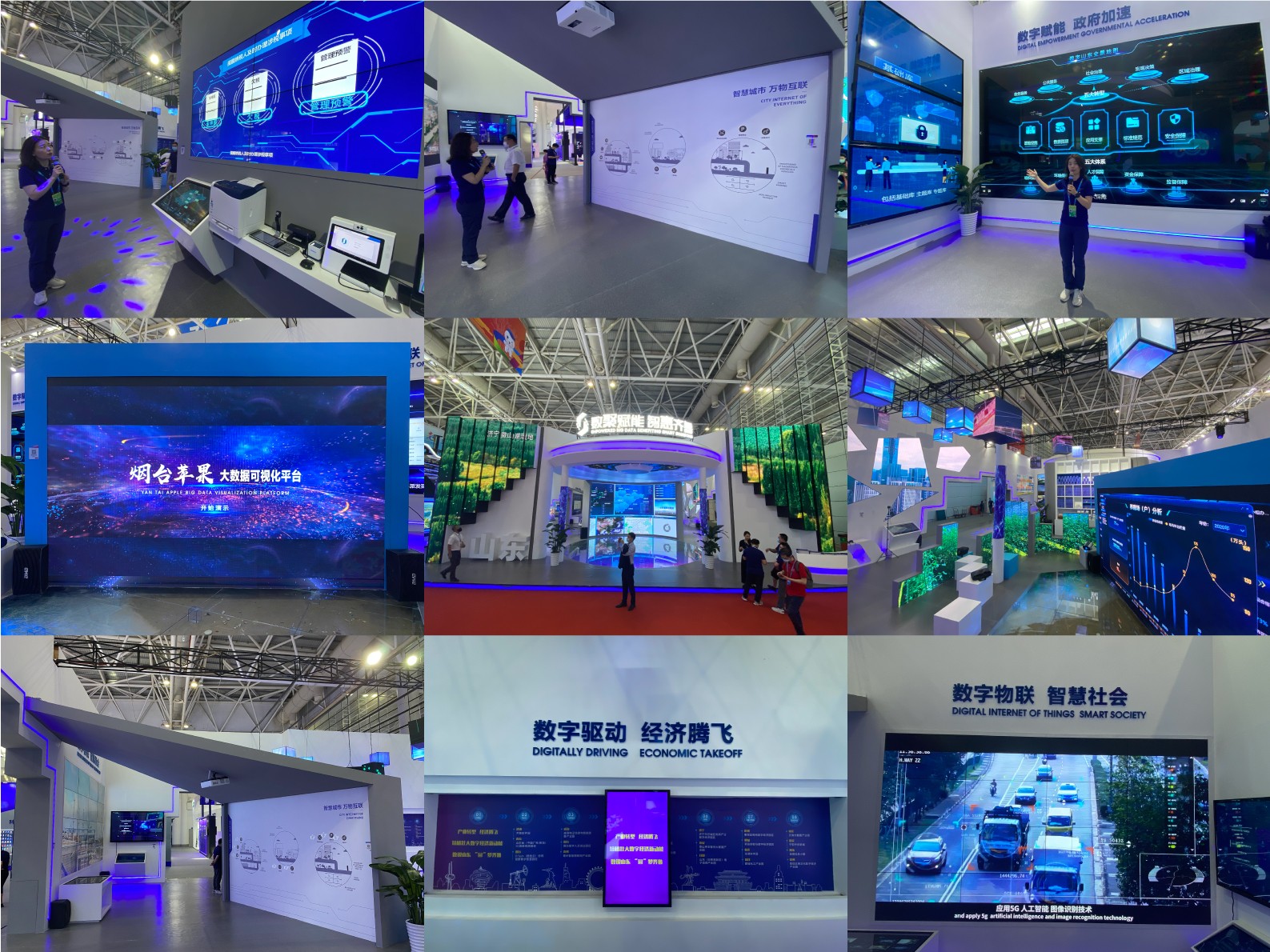 展馆展览内容围绕数字政府、数字社会、数字经济三大板块,集中展示山东省在数据赋能、互联网+政务、新型智慧城市和数字经济领域的建设成果。数字政府区域通过APP互动、现场接入应用平台、远程实时监控企业开办进程等新颖的体验式展示手段,让“爱山东”“数字山东全景地图”等数字政府山东品牌进行有效地传播。数字社会区域以数字化形式结合创意互动玩法,通过石墨投影互动墙、实时数据传输等方式充分展现山东省分级分类“千城千面”的新型智慧城市发展。 数字经济区域创意海洋实景造景与LED柱相结合,展现出山东省向海图强的梦想。