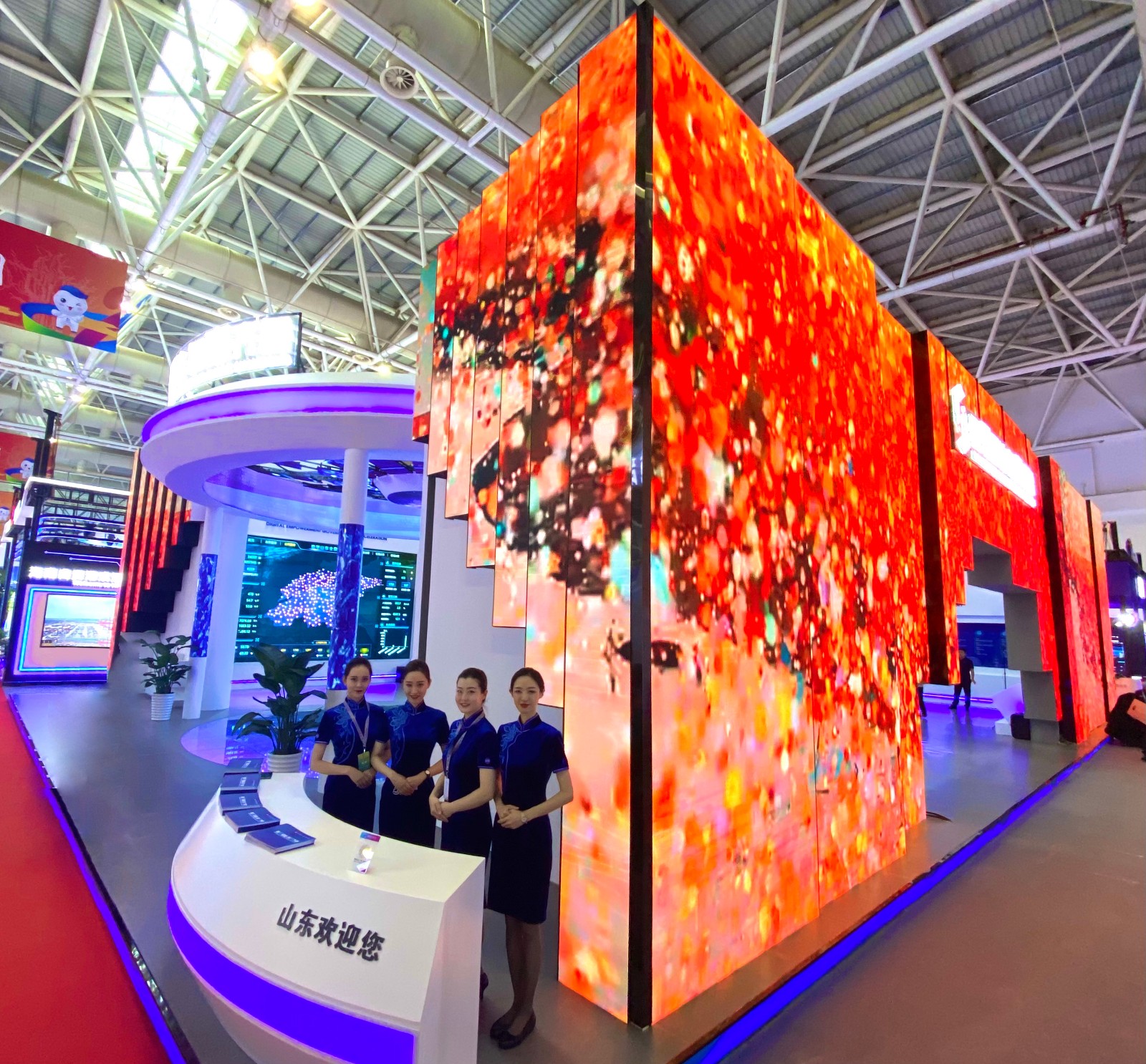 新之航从4.0智能展览馆行业标准角度出发,为数字山东馆这一数字化特装展馆量身定制“4.0”特装展馆解决方案,外观应用LED显示屏总面积共计316平方米,馆内应用LED地砖屏100平方米、异形屏LED屏 47平方米、拼接屏共计54块,利用大数据、人工智能、虚拟现实、区块链等多种智慧化手段,通过“云数据流+沉浸体验+人馆交融+世界开关”的发展新模式,让展馆的各部分充分地与互联网融合,实现大数据的采集、传输、交互和共享。