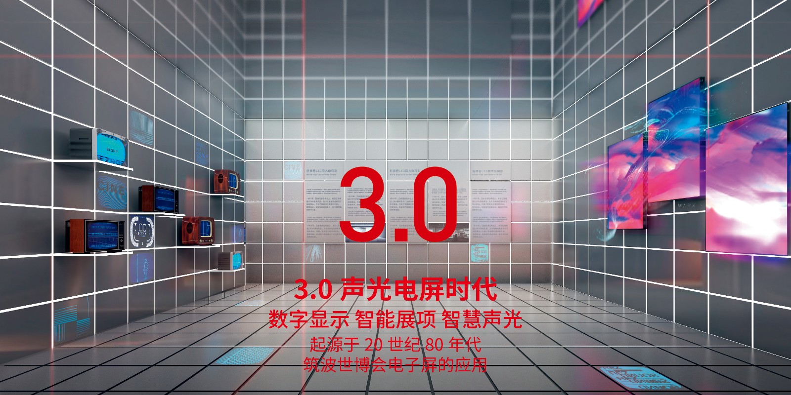 世界展览展示博物馆主要分8个展厅,序厅:运用太空舱元素穿越人类展览展示发展史:“欢迎大家莅临世界展览展示发展博物馆暨4.0展馆设计标准样板工程馆,大家将在本馆穿越历史,领略世界展览展示从1.0平面展示时代、2.0实物展示时代、3.0声光电屏时代到4.0智能互动时代的发展脉络,同时大家还可以看到1.0、2.0、3.0、4.0不同设计标准的样板工程馆,最后我们将一起仰望太空,展望展馆设计5.0新时代,请大家一起通过时光隧道,来到45000年前的原始人洞窟......”。第一展厅:洞窟壁画,来自远古的传奇故事,1.0平面展示时代(二维展示),始于45000年前。第二展厅:珍宝陈列,全球进入万物展示时代,2.0实物展示时代(三维展示,实物展览),始于公元前290年。第三展厅:处处开“屏”,科技开启数字影像展示先河,3.0声光电屏展示时代(数字显示,智能展项,智慧声光),始于20世纪80年代。第四展厅:“人馆交融”,沉浸体验创造虚实交互新世界,4.0智能互动时代(实时数据,沉浸体验,人机交互,双向智控),始于21世纪初期。第五展厅:未来展示厅,5.0生物智能展示时代。第六展厅:国际著名博物馆数字展示厅。第七展厅:居馆办公空间,现代办公环境与展馆的智能化融合,展示未来科技办公空间的发展趋势。